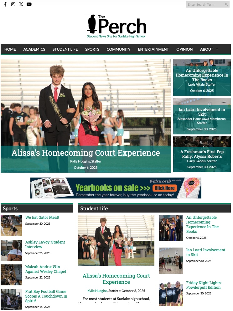 Originally launched through our Yearbook program, The Perch has grown into a proud tradition of student storytelling and reporting. Over the years, both Journalism and Yearbook students have contributed to its success—writing articles, capturing photos, and highlighting the many aspects of life at Sunlake High.
